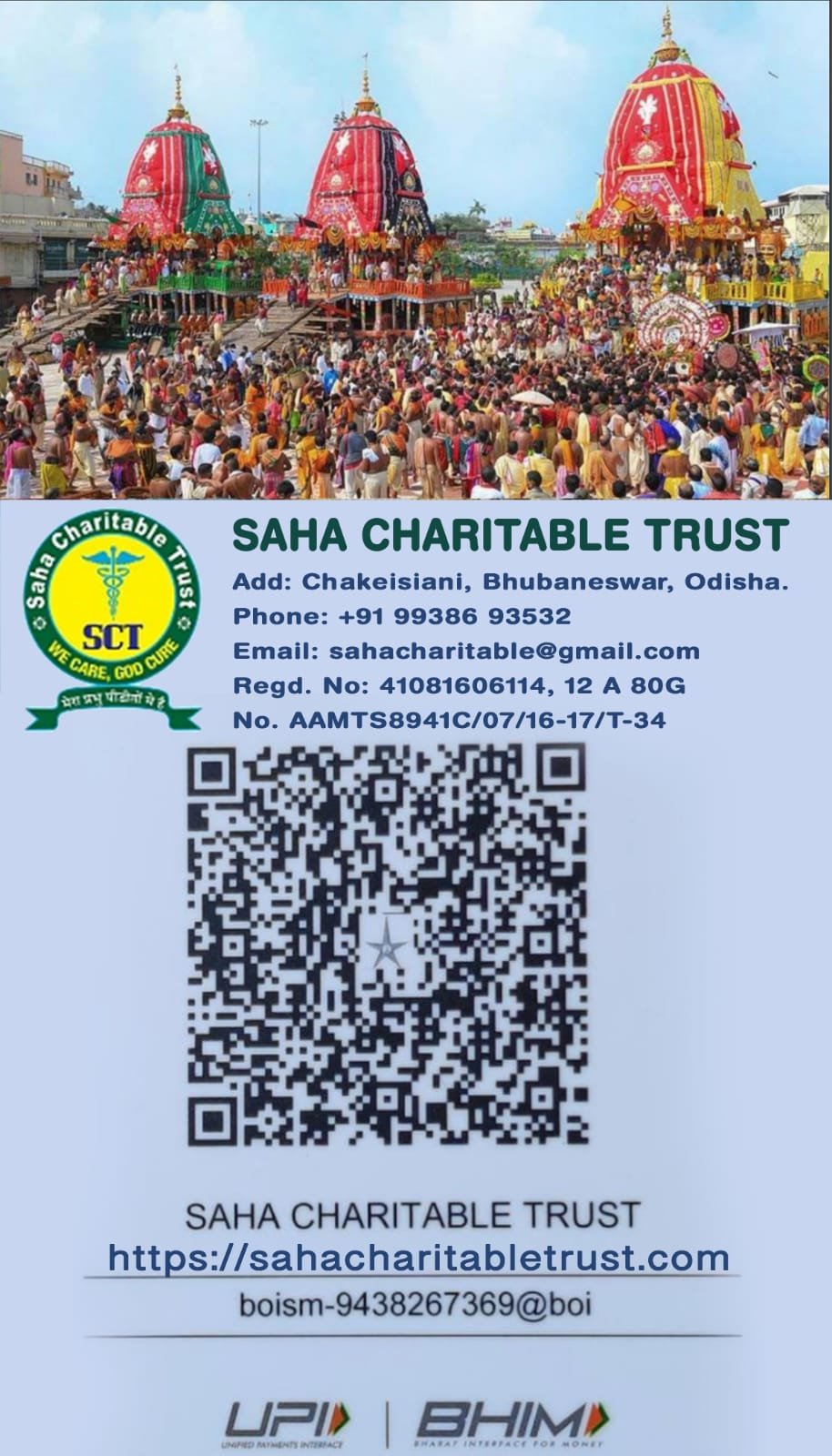 साहा चैरिटेबल ट्रस्ट 10 साल से जगन्नाथ महाप्रभु रथ यात्रा में प्रसाद सेवन केंद्रों लगाते आए हैं, करुणाकर चलते 2 साल बंद थे इस साल 2022 में जगन्नाथ महाप्रभु जी का रथ यात्रा में दूर-दूर से आने वाले भक्तों के लिए, 01/07/2022 से 09/07/2022 तक, साहा चैरिटेबल ट्रस्ट के तरफ से निशुल्क प्रसाद सेवन केंद्रों लगाया जाएगा, श्रद्धालु भक्तों को निवेदन है जथा समर्थ दानपुरवर्क जगन्नाथ महाप्रभु का आशीर्वाद लाभ करे, जोगाजोग नंबर 09938693532, इस नंबर व्हाट्सएप भी हैं, धन्यवाद। जय जगन्नाथ 🙏